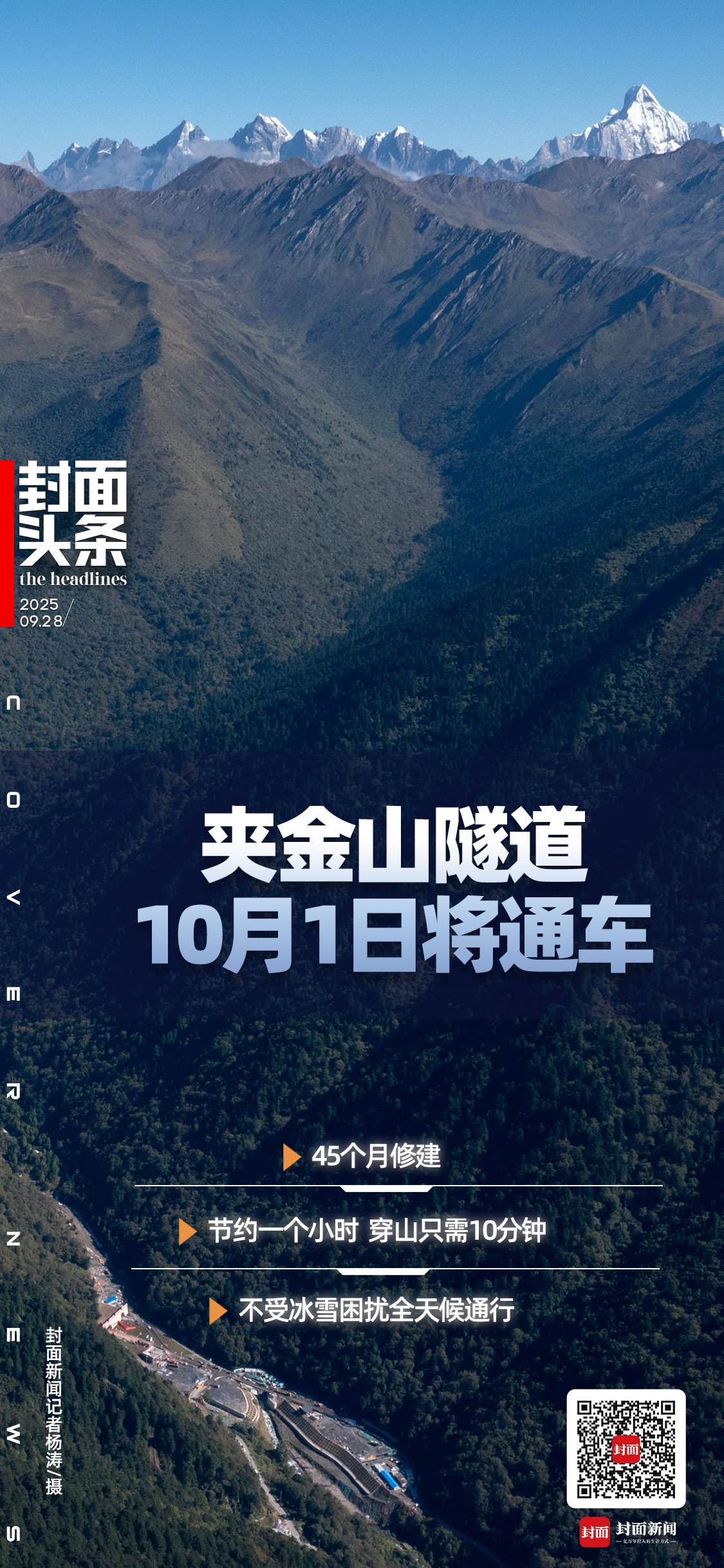9月28日,四川省交通运输厅正式官宣:2025年10月1日,经过45个月的艰苦建设,连接四川省雅安市宝兴县和阿坝州小金县的夹金山隧道将开通试运行。9.35公里的隧道主洞通车后,国道351线可节约34公里的通行里程,翻山时间将从1个多小时缩短到10分钟;还将有效解决越岭段冬季通行问题,实现常年全天候通行。