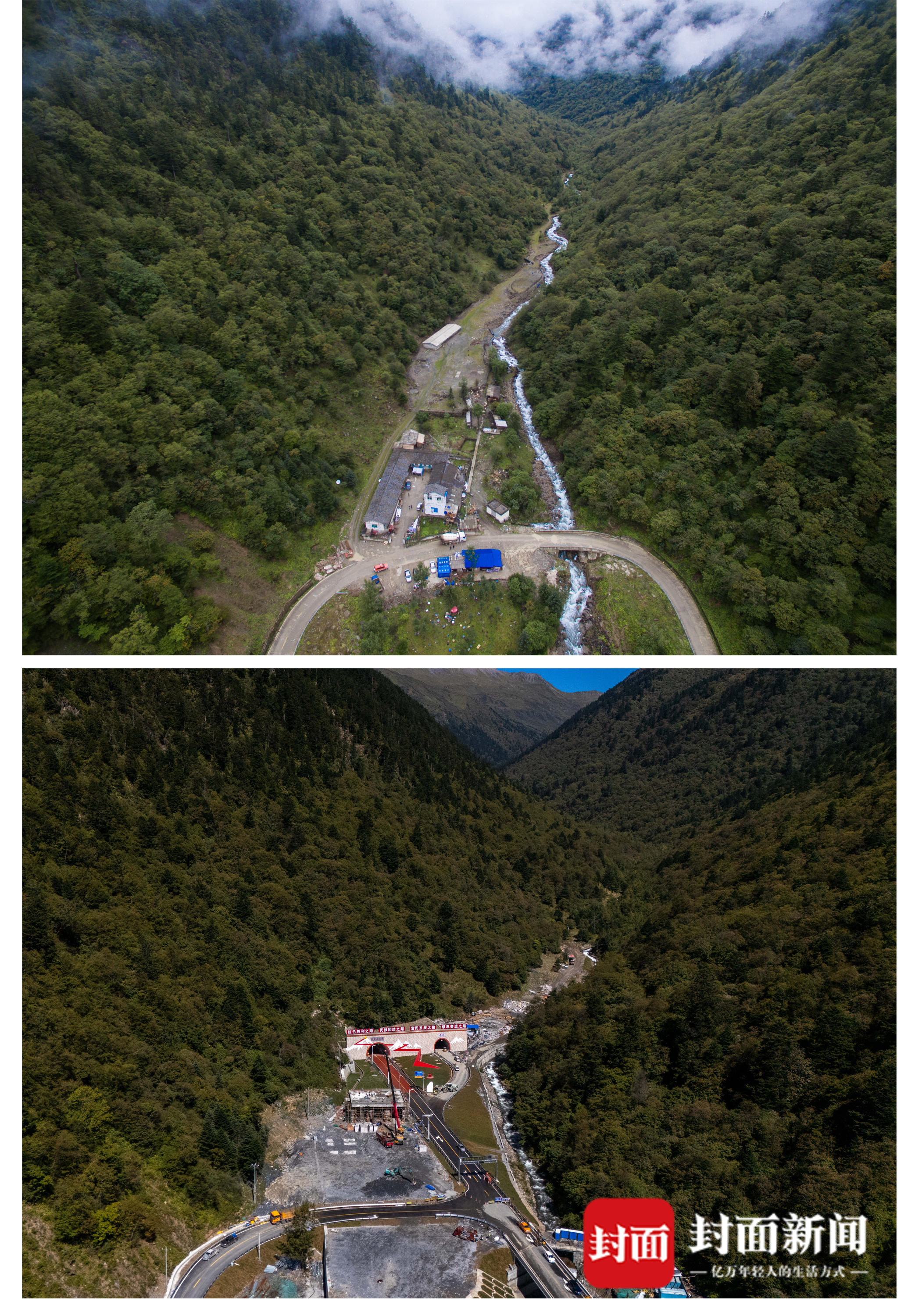 夹金山隧道宝兴方向入口同一位置照片拼图。上图摄于2015年9月8日,下图摄于2025年9月24日。摄影:杨涛