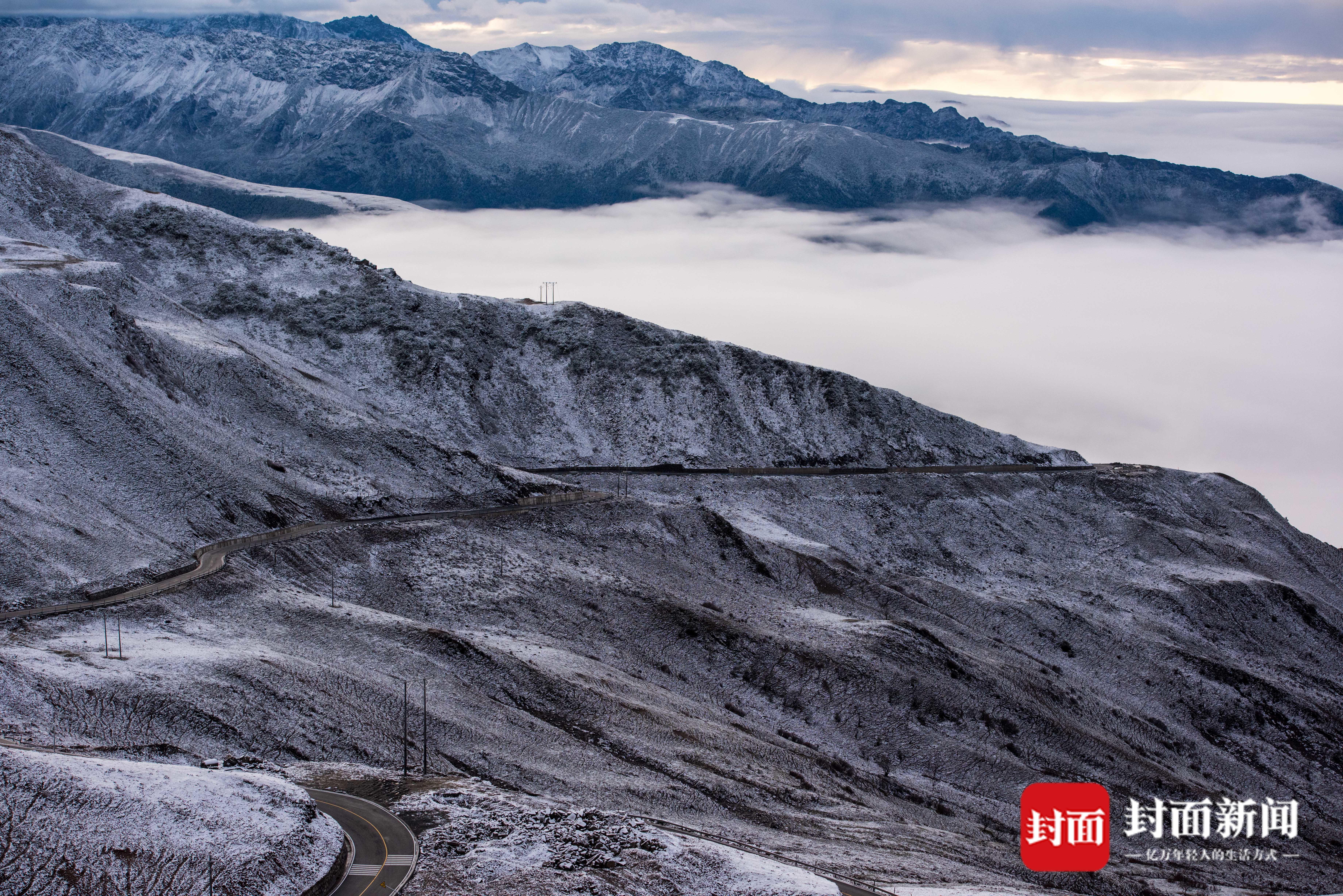2020年12月9日,雪后的夹金山垭口,通往小金县方向的道路在云雾中若隐若现。