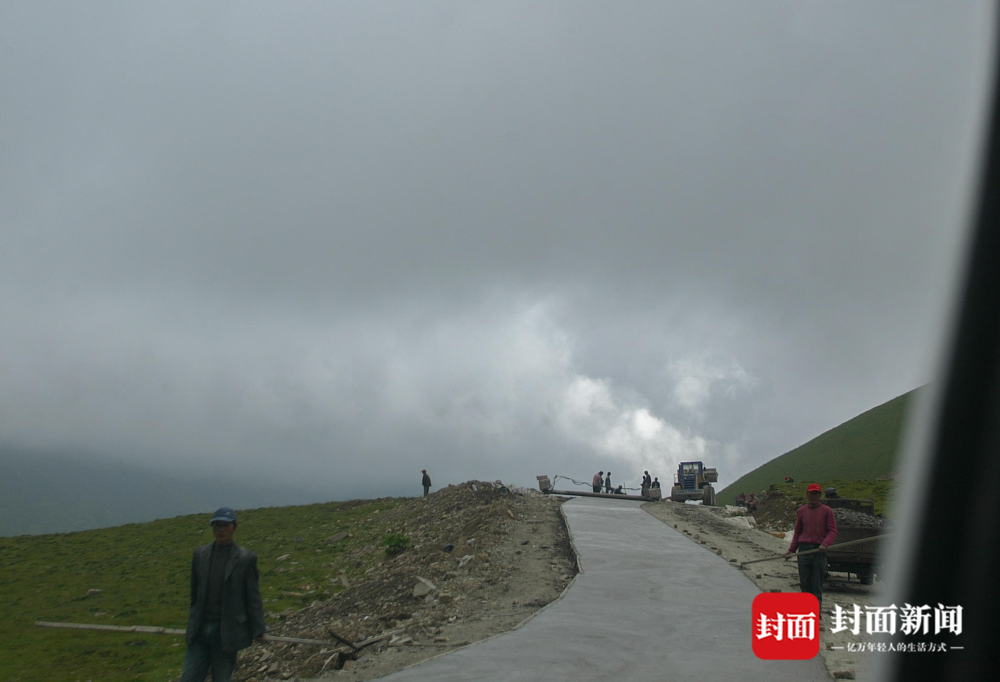 2007年8月8日,夹金山公路垭口附近,工作人员正在铺设水泥路面。摄影:杨涛